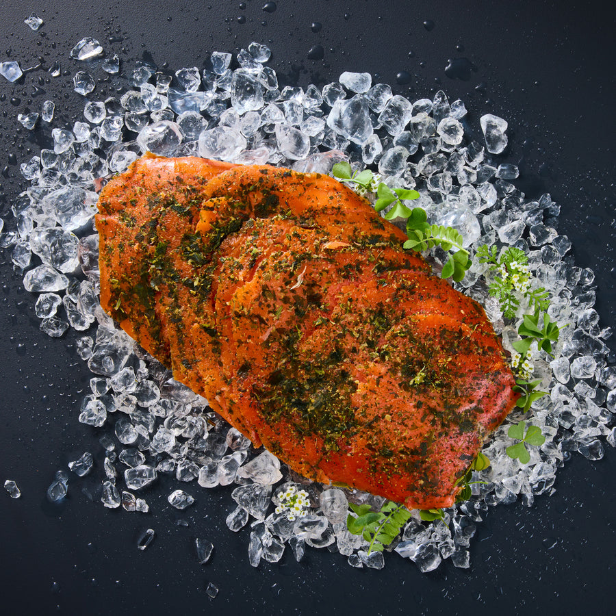 Pahle Sockeye-Lachs, frisch aus Alaska. Behutsam filetiert und unter echtem Buchenholz kaltgeräuchert. Anschließend mit ausgewählten Wildkräutern verfeinert.